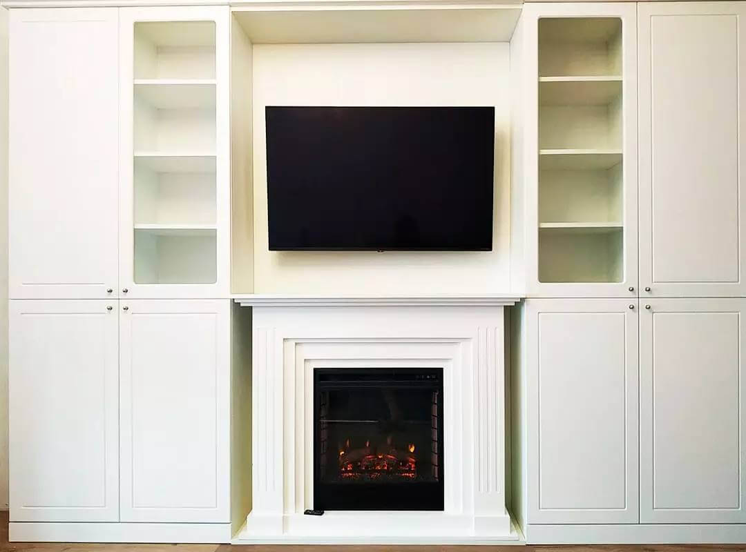 Неоклассический стиль оформления интерьеров остается популярным и на сегодняшний день. На фото нашего проекта можно проследить четкую симметрию, которая характерна для стиля неоклассика. С двух сторон от камина и телевизора установлены абсолютно идентичные книжные шкафы. Подобные однотонные шкафы — еще одна особенная деталь неоклассического стиля.
